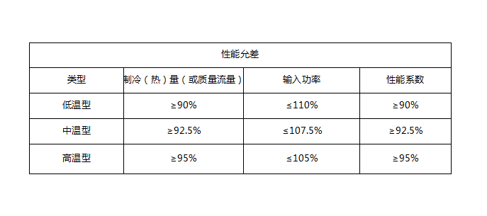 中溫型壓縮機或壓縮機組的制冷量、熱量或質(zhì)量流量應(yīng)大于等于92.5%,輸入功率小于等于107.5%,性能系數(shù)大于等于92.5%。